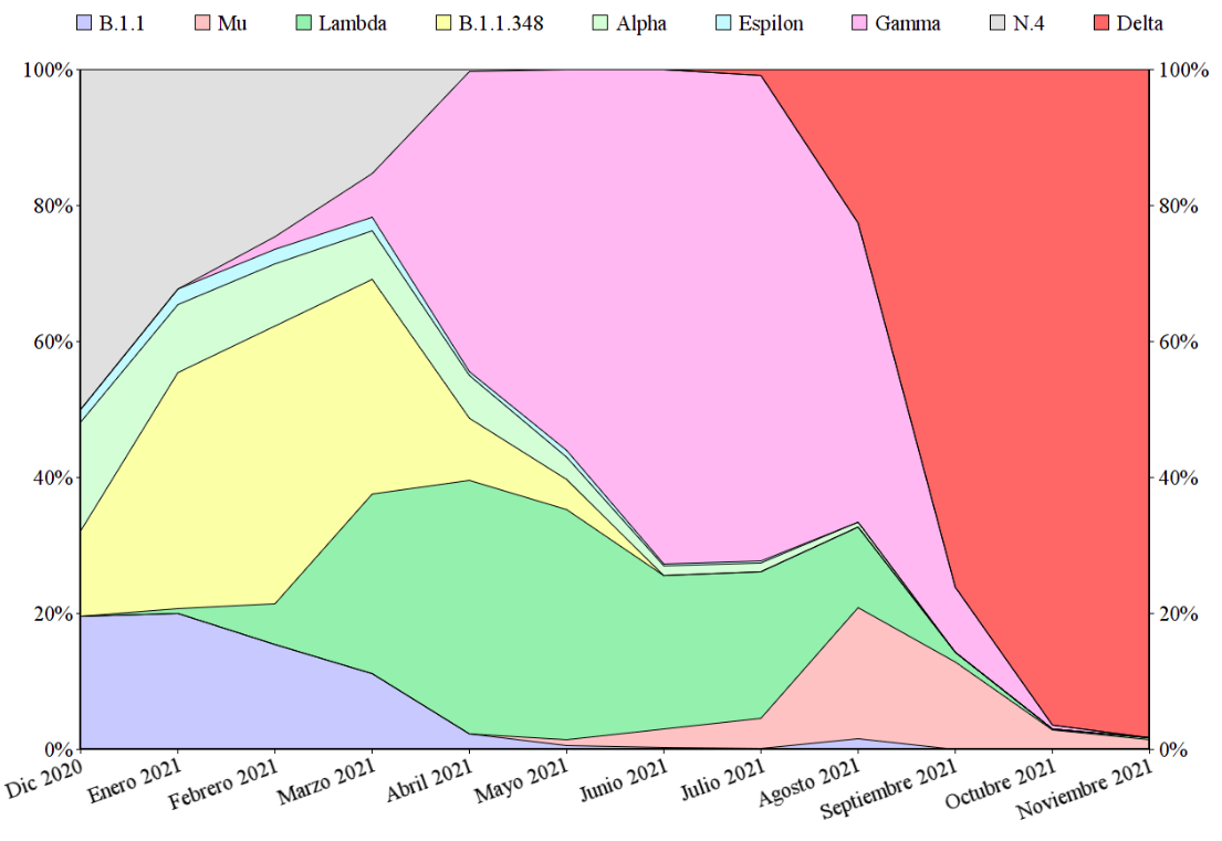 En la semana del 14 al 20 de noviembre fueron analizados 3.702 casos. La variante Delta alcanzó 92,1%, Mu en 3 casos y Gamma en 2 casos. No se identificó Alfa y Lambda.