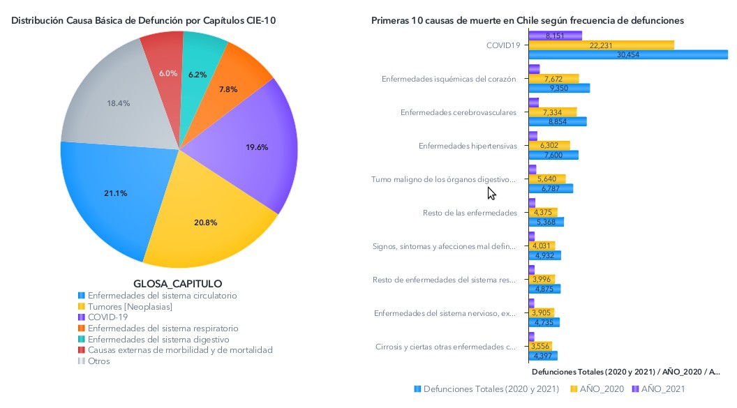 A continuación la gráfica muestra las principales causas de muerte en Chile en 2020 y 2021, donde la Covid-19 ocupa el primer lugar.