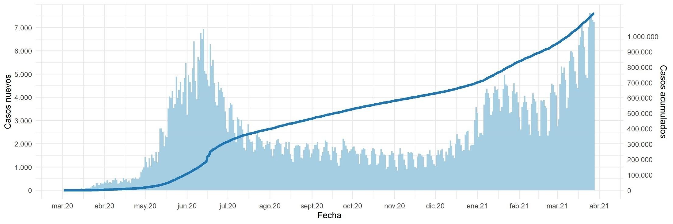 [caption id="attachment_95870" align="alignnone" width="2212"] Figura: Número de casos nuevos confirmados (incluye probables) y acumulados de COVID-19 según fecha de confirmación por laboratorio. Chile, al 28 de marzo de 2021 (barras = casos nuevos; línea = casos acumulados).[/caption]
