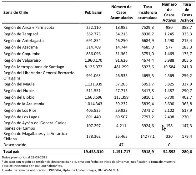 [caption id="attachment_95869" align="alignnone" width="627"] Tabla: Número de casos y tasa de incidencia de casos Covid-19 según región de residencia en Chile, con fecha al 28 de marzo de 2020.[/caption]