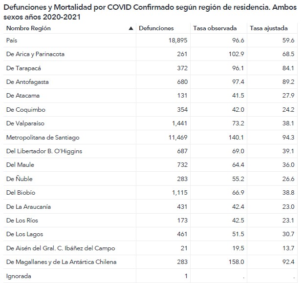 La cantidad muertes considerando casos confirmados alcanzó las 16.817 en 2020 más 2.078 personas este 2021 sumando 18.895. La región del Biobío registró 824 muertes en 2020 y 291 muertes en 2021 alcanzando un total de 1.115