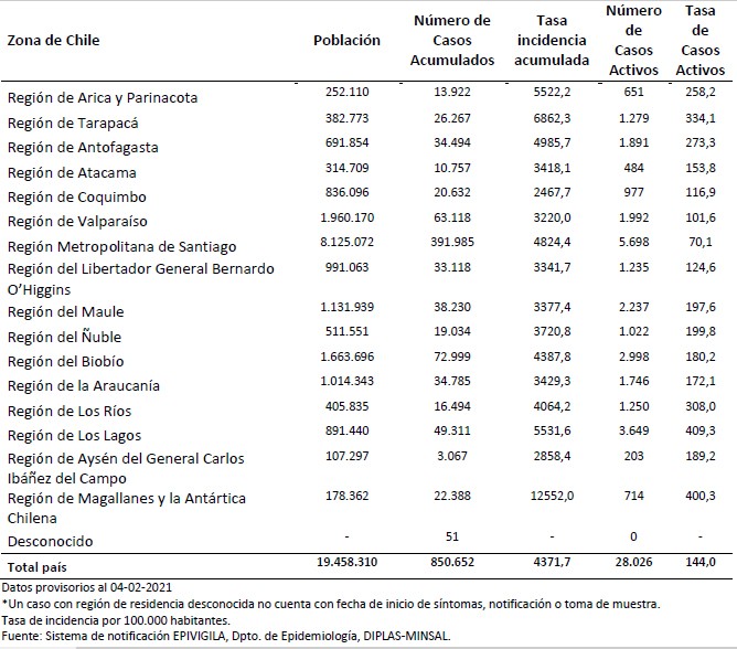 La siguiente tabla muestra el número de casos y tasa de incidencia de casos COVID-19 según región de residencia en Chile, con fecha al 4 de febrero de 2020.