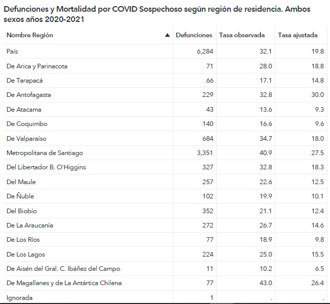 Mientras que la cifra de fallecimientos sospechosos de COVID-19 fueron 5.427 en 2020 más 857 personas este 2021 alcanzando 6.284. El Biobío presentó 241 muertes en 2020 y 111 muertes sospechosas en 2021 para alcanzar un total de 352 personas.