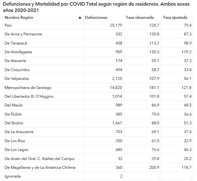 La cifra total de personas fallecidas asociadas a COVID-19 (22.244 en 2020 y 2.935 en 2021) alcanzó las 25.179 personas. En la región del Biobío el número de defunciones totales alcanzó las 1.065 en 2020 y 402 este 2021 para alcanzar un total de 1.467