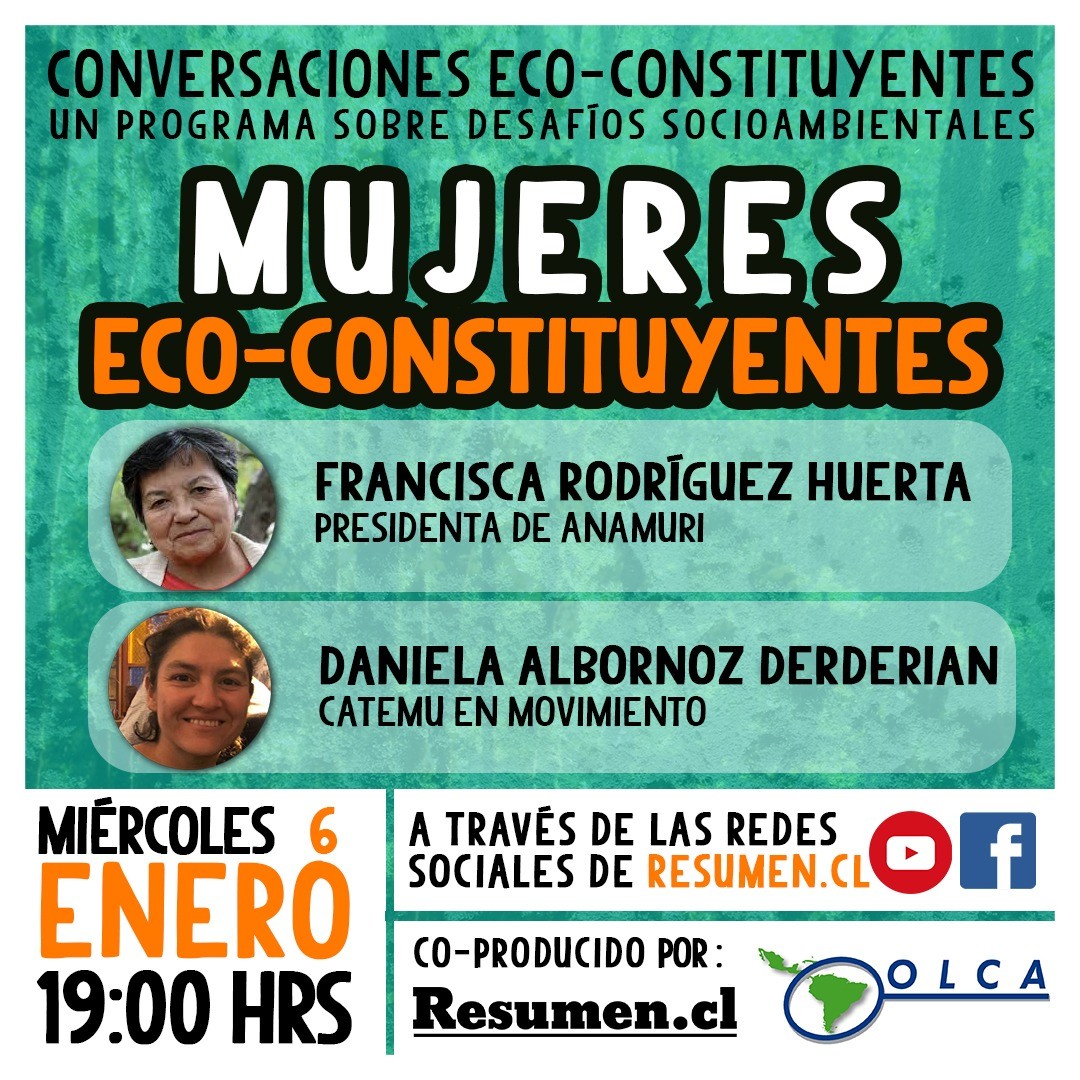 [resumen.cl] En el quinto capítulo de «Conversaciones Eco-Constituyentes» entrevistaremos a Francisca Rodríguez Huerta, presidenta de ANAMURI, y Daniela Albornoz Derderian, integrante de CATEMU en Movimiento, para analizar el rol de las mujeres desde las luchas socioambientales en el proceso constituyente.