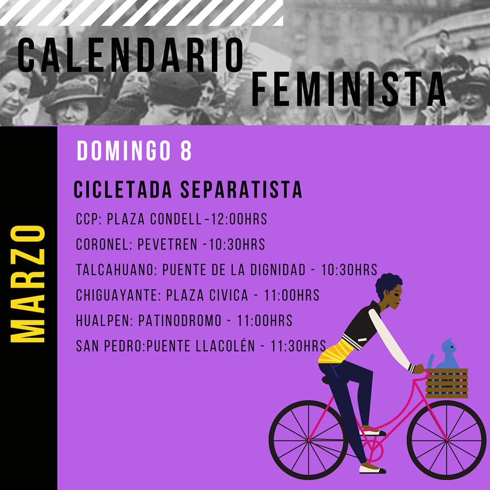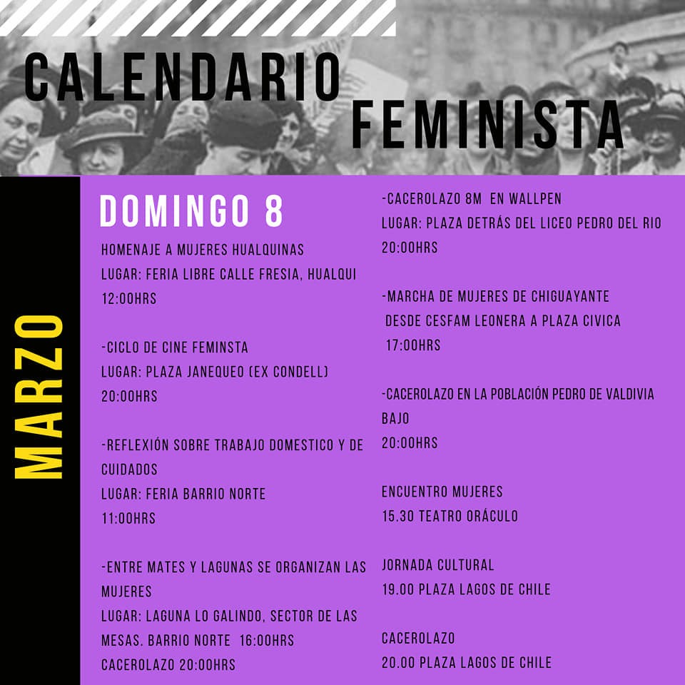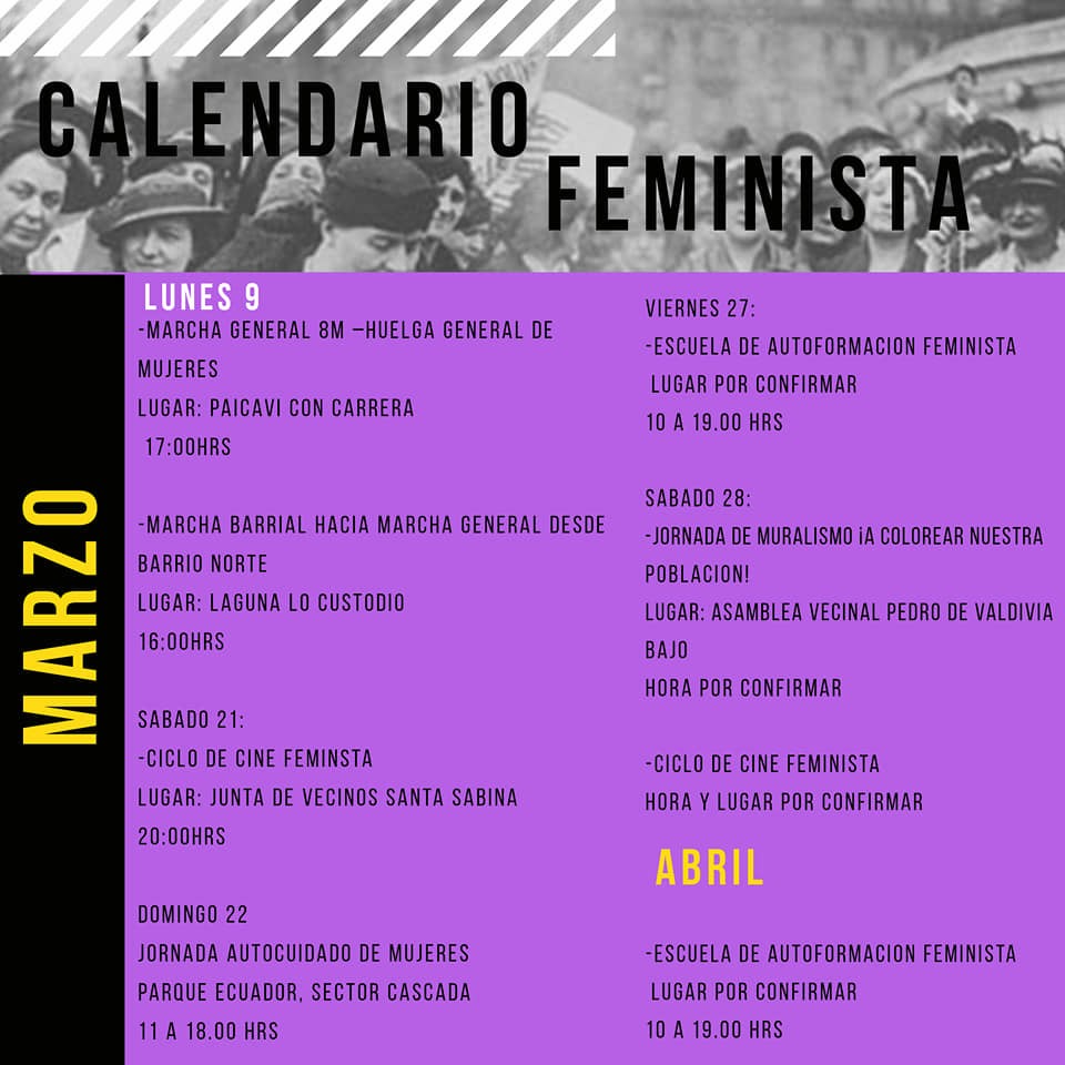 Junto a los hitos de la marcha, el cacerolazo y la huelga, se llama también a informarse y participar de todas las actividades que estarán dando vida al llamado Marzo Feminista, que durante este mes incluye teatro, cicletada separatista, cine feminista itinerante en Juntas de Vecinas, conversatorios, mateadas, pintatón de lienzos, muralismo, escuelas de autoformación entre otras tantas instancias de encuentro realizadas para y por mujeres.
