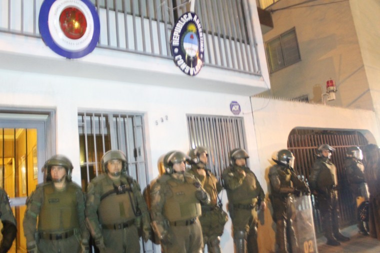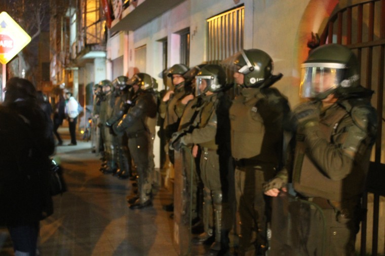 Las manifestantes utilizaron pañoletas verdes en alusión al color que ha utilizado el movimiento de mujeres en argentina, que se ha movilizado por la legalización del aborto. Desde el comienzo de la protesta; un amplio contingente de Carabineros de fuerzas especiales, provistos de carros lanza agua y lanza gases, protegieron el frontis de del consulado argentino y rodearon a las manifestantes.