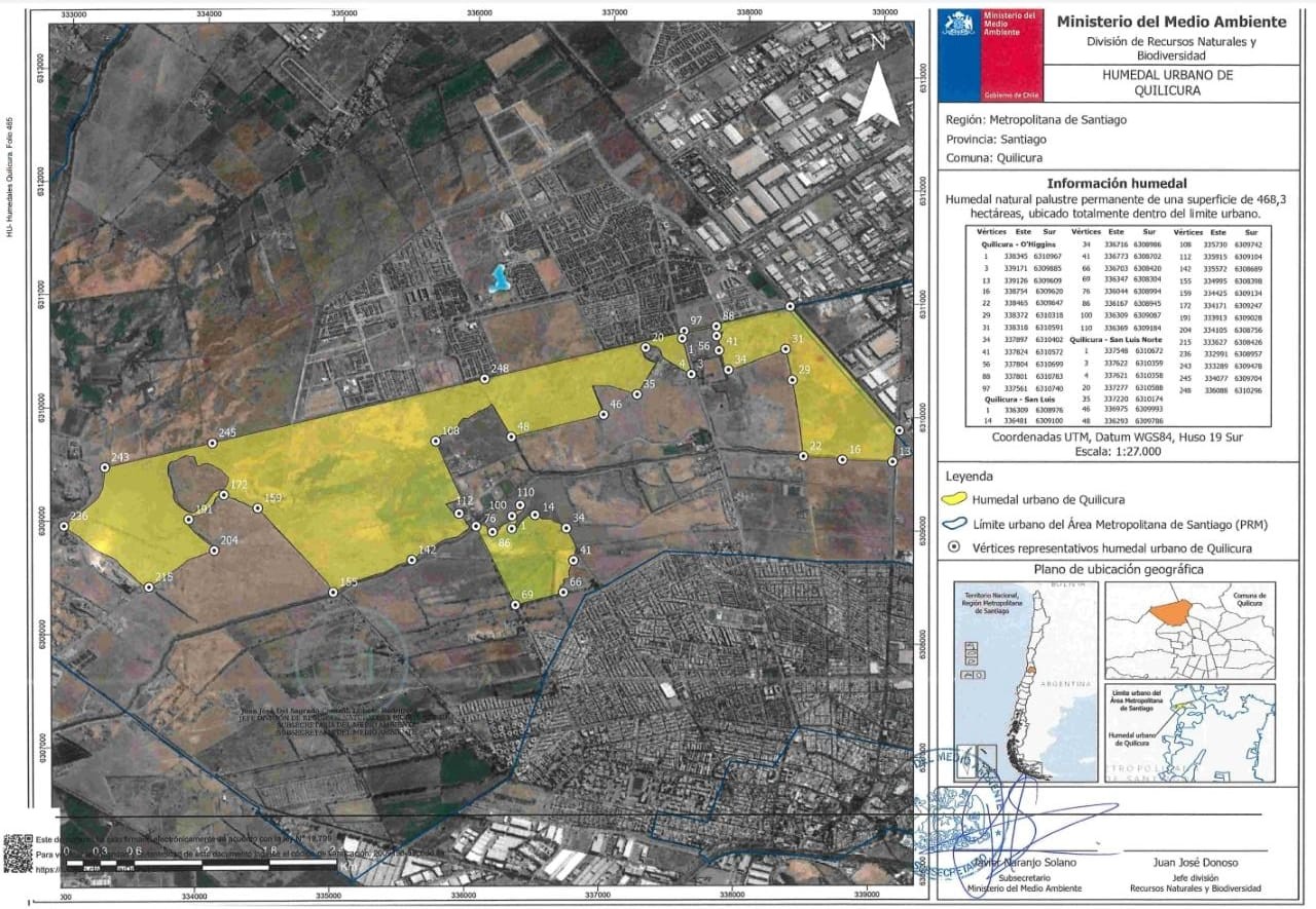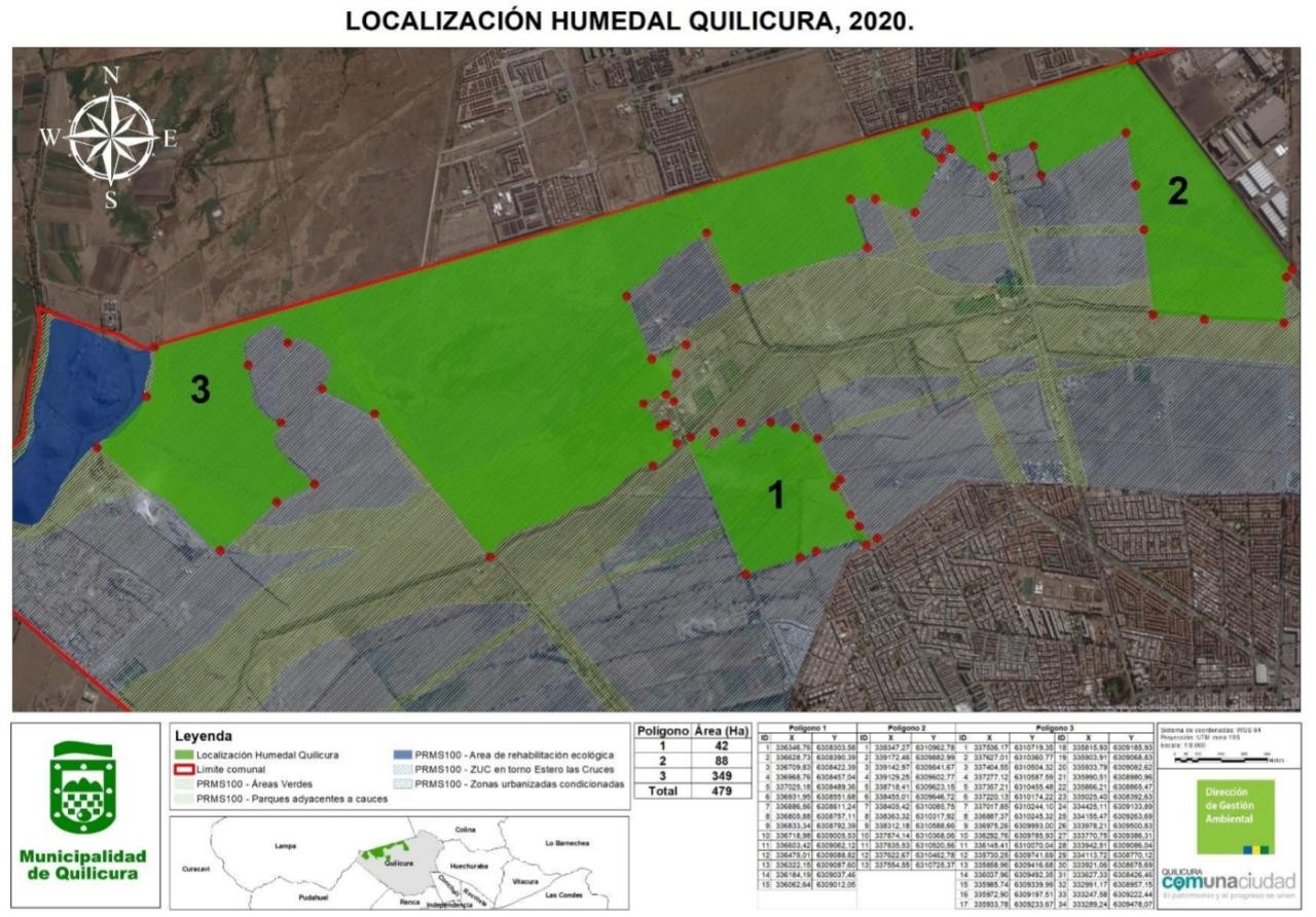 Por este motivo, se realizó una mesa técnica, que fue dirigida por el director del área de Gestión Ambiental, Felipe González que junto a Resistencia Socioambiental Quilicura y Corporación Ngen terminaron el proceso y enviaron el expediente al Ministerio del Medio Ambiente solicitando el reconocimiento de 3 polígonos que comprendían un total de 479 hectáreas, que finalmente culminó con el reconocimiento oficial por parte del Ministerio del Medio Ambiente de 468,3 hectáreas del Humedal Urbano de Quilicura en virtud a la ley 21.202.