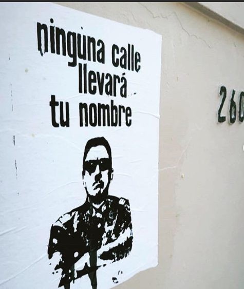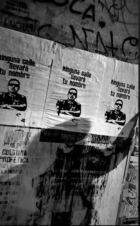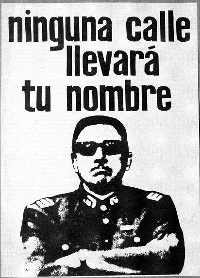 Uno de estos corresponde a una imagen de Pinochet, con lentes oscuros y brazos cruzados, con la frase "Ninguna calle llevará tu nombre".
