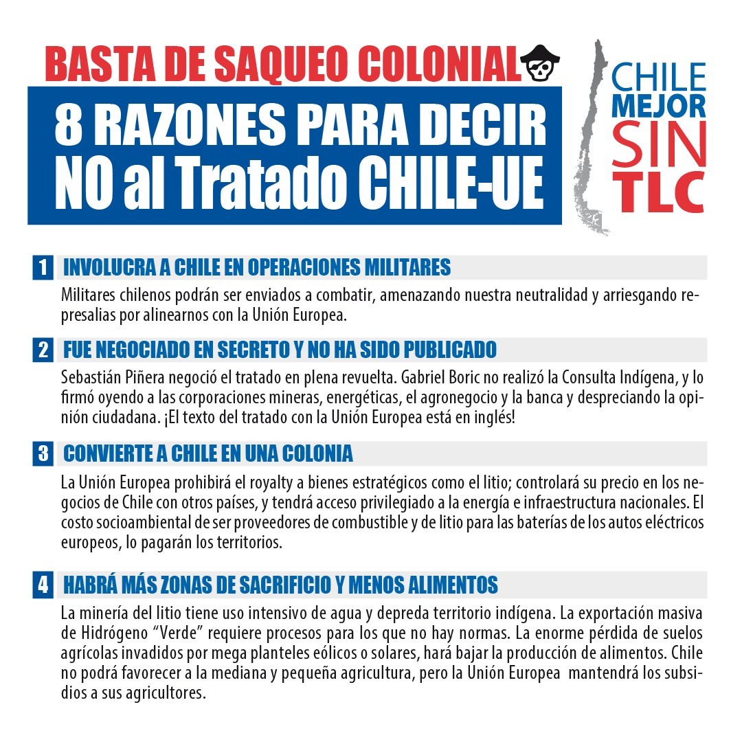 El tratado Chile-Unión Europea que se votará a comienzos de enero en Europa, impone el colonialismo energético. El gobierno chileno no lo envía aun al Congreso y los parlamentarios ignoran su contenido. Desde Chile Mejor sin TLC planteamos nuestro firme rechazo a este Tratado.