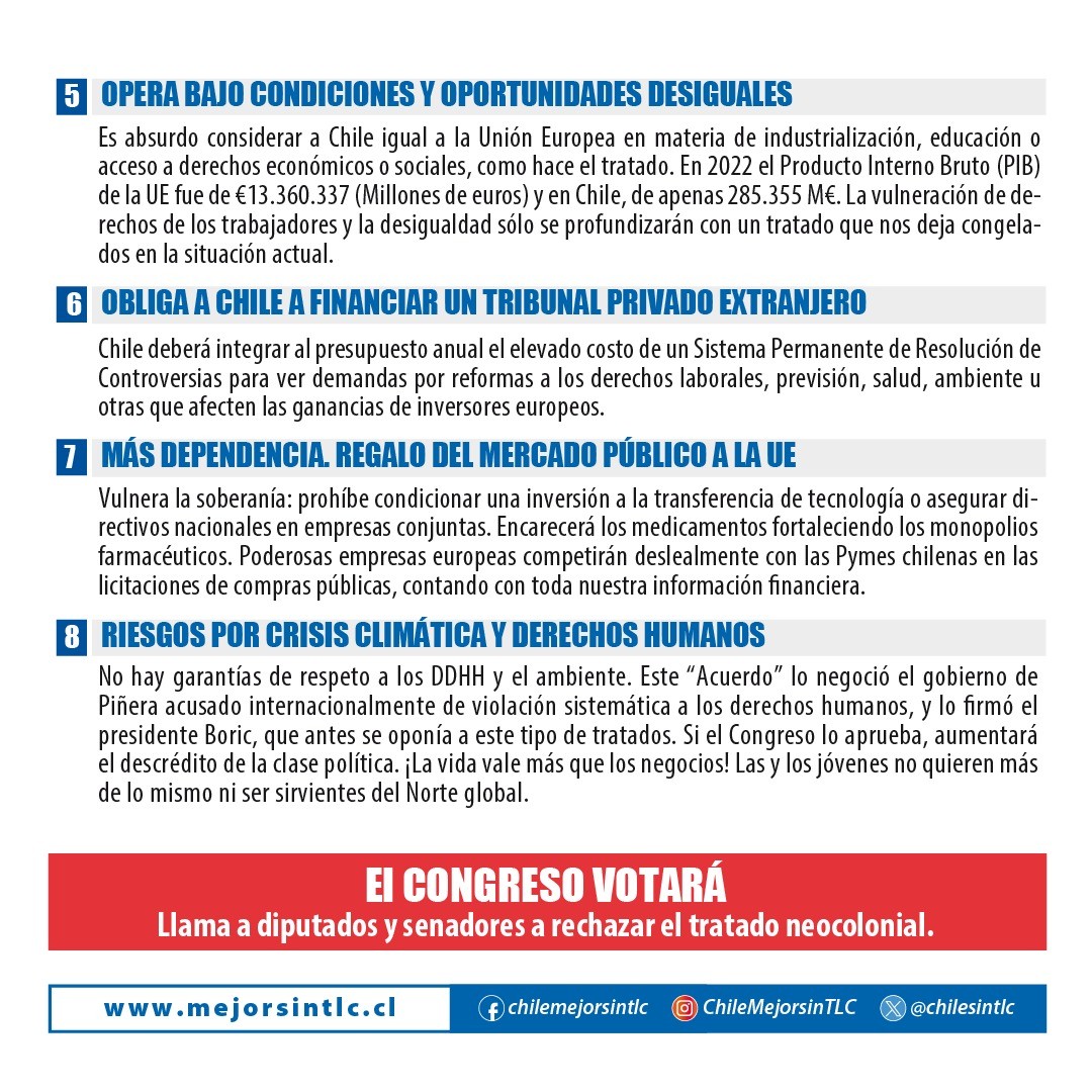Posiblemente el gobierno de Boric elija los días previos a la Navidad, los días previos al receso parlamentario de febrero o los primeros días de marzo de 2024 para el envío del proyecto. Chile Mejor sin TLC está desde ya informando a las organizaciones socioambientales, campesinas, sindicales y políticas sobre las razones para decir #NO AL TlcChile -Unión Europea. Aun es posible frenar este nuevo atentado contra la vida y el futuro especialmente de las y los jóvenes de nuestro territorio.