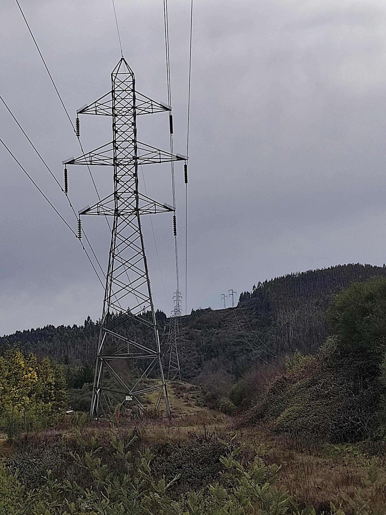 Ejemplos de torres de alta tensión y su faja de servidumbre bajo los cables junto a la ruta Concepción-Cabrero