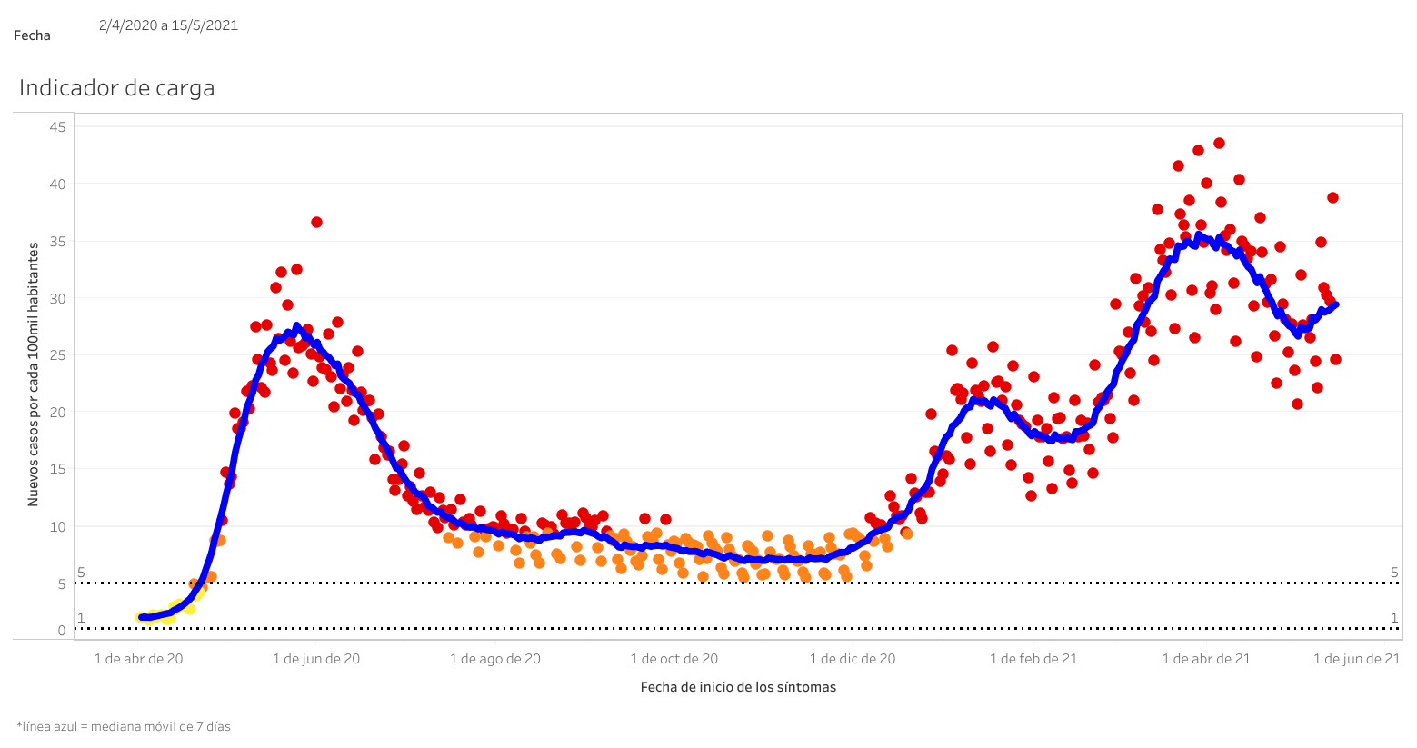 Variación del indicador de carga (Promedio de casos nuevos de contagio en los últimos siete días) en Chile entre abril de 2020 y mayo de 2021.