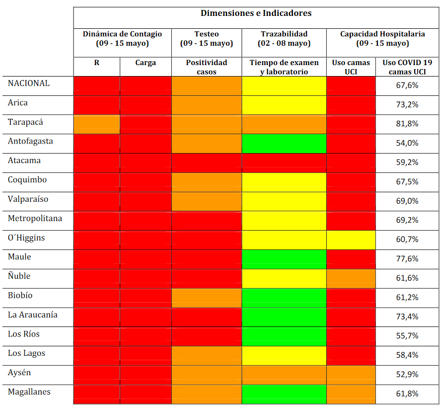 Resumen de indicadores por región. Los colores muestran el estado de la propagación del coronavirus SARS-CoV-2 en Chile. En rojo: Fuera de control. En naranjo: El umbral más peligroso. En amarillo acercándose al nivel de control más bajo. En verde: en camino a la contención. Fuente: https://www.icovidchile.cl/informes