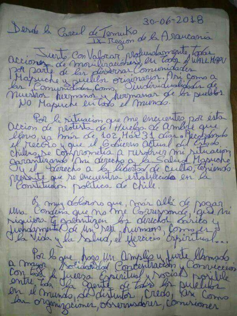 A través de un comunicado público difundido por Radio Kurruf el machi Celestino Córdova había señalado anteriormente que "Se debe entender que, de no otorgarse la salida a mi Rewe, igualmente tendré un desenlace fatal lentamente. Por tanto, prefiero morir luchando"