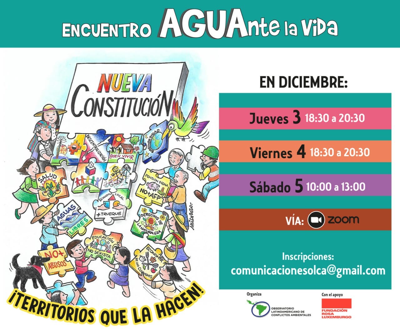 El encuentro "AGUAnte la Vida" por primera vez se realizará de manera virtual y en horarios acotados el 3, 4 y 5 de diciembre. La actividad que este año lleva el titulo "Los territorios hablan: Agua y Naturaleza en el Proceso Constituyente" es parte de un esfuerzo que hace años convoca a organizaciones de todo el país a construir una reflexión y práctica colectiva, que permita transitar desde el extractivismo al buen vivir, de ahí la pertinencia de poner al centro del debate constituyente el agua y la naturaleza.