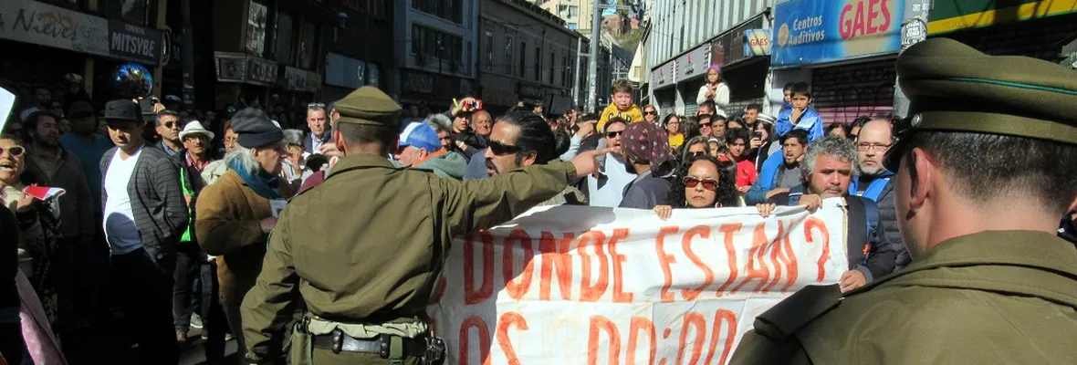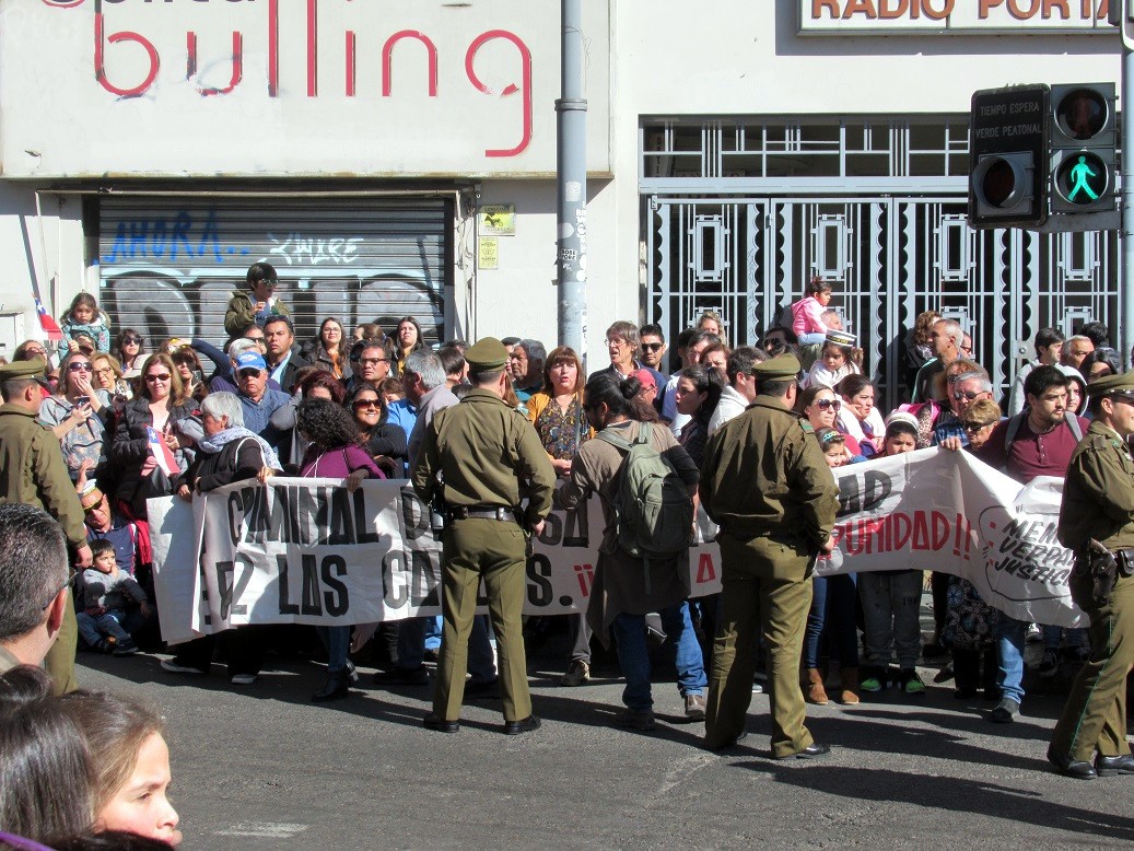 Un piquete de Carabineros intentó bloquear la manifestación, permitiendo además que algunos elementos de civil, que tenían todas las características de ser personal en retiro de la Marina y/o familiares de uniformados, actuaran agresiva e impunemente destruyendo los carteles y lienzos.