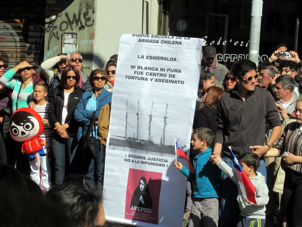 Las y los integrantes de las organizaciones de Derechos Humanos no se amilanaron ante esta violenta actuación y continuaron lanzando panfletos y coreando consignas tales como: “La Armada chilena debe responder, matar a los chilenos no era su deber”, “La Esmeralda, ni blanca ni pura, fue centro de tortura”; “Justicia, verdad, no a la impunidad”; “No a la amnistía, no a la impunidad, la sangre de los muertos no se puede negociar”, transformando esta manifestación en una marcha de protesta que se desplazó por el medio de la calle Condell, en cuyas veredas circundantes se encontraba un numeroso grupo de personas esperando el desfile de los uniformados .