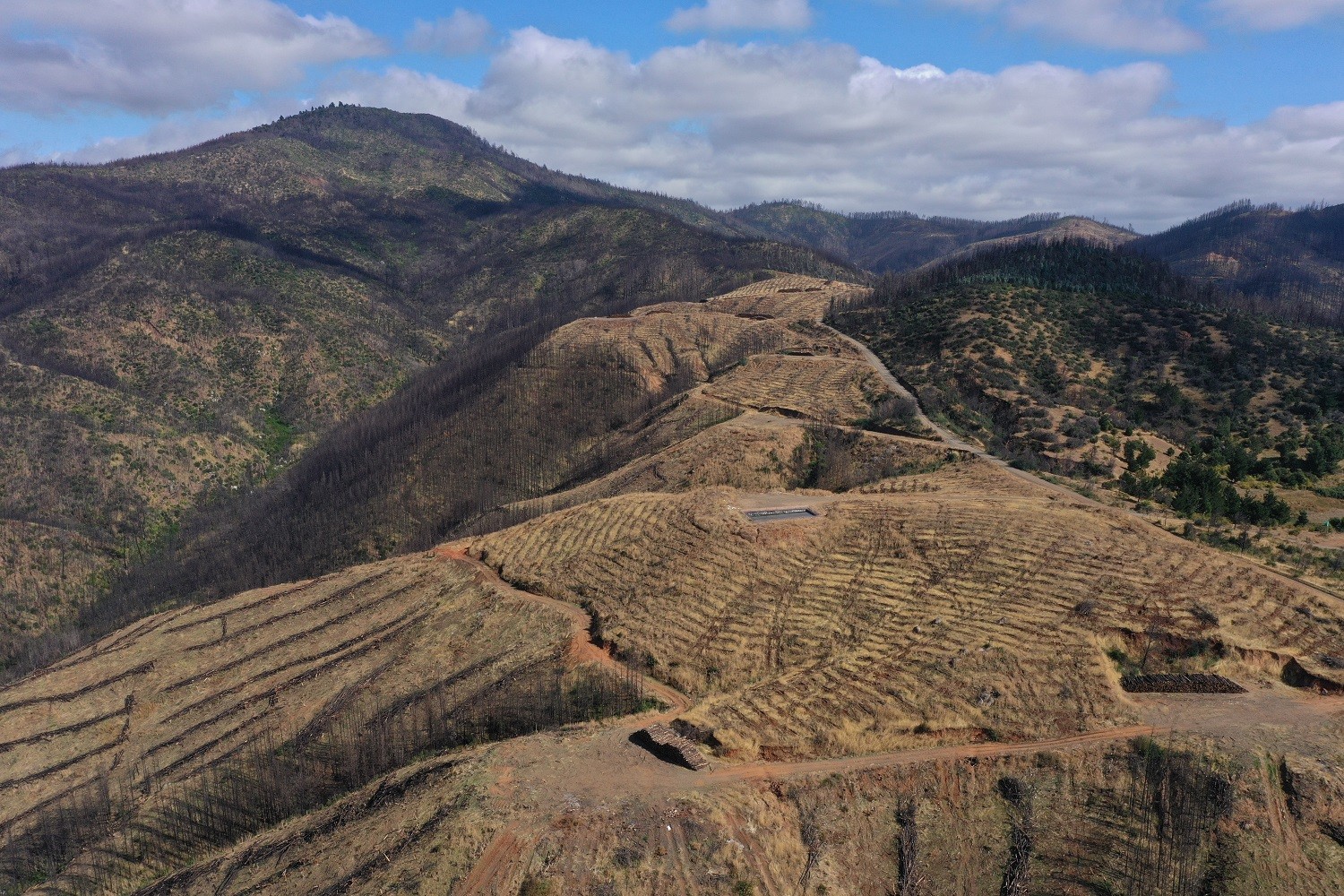 Tala rasa de monocultivo forestal post incendio en cerro Cayumanque en Quillón