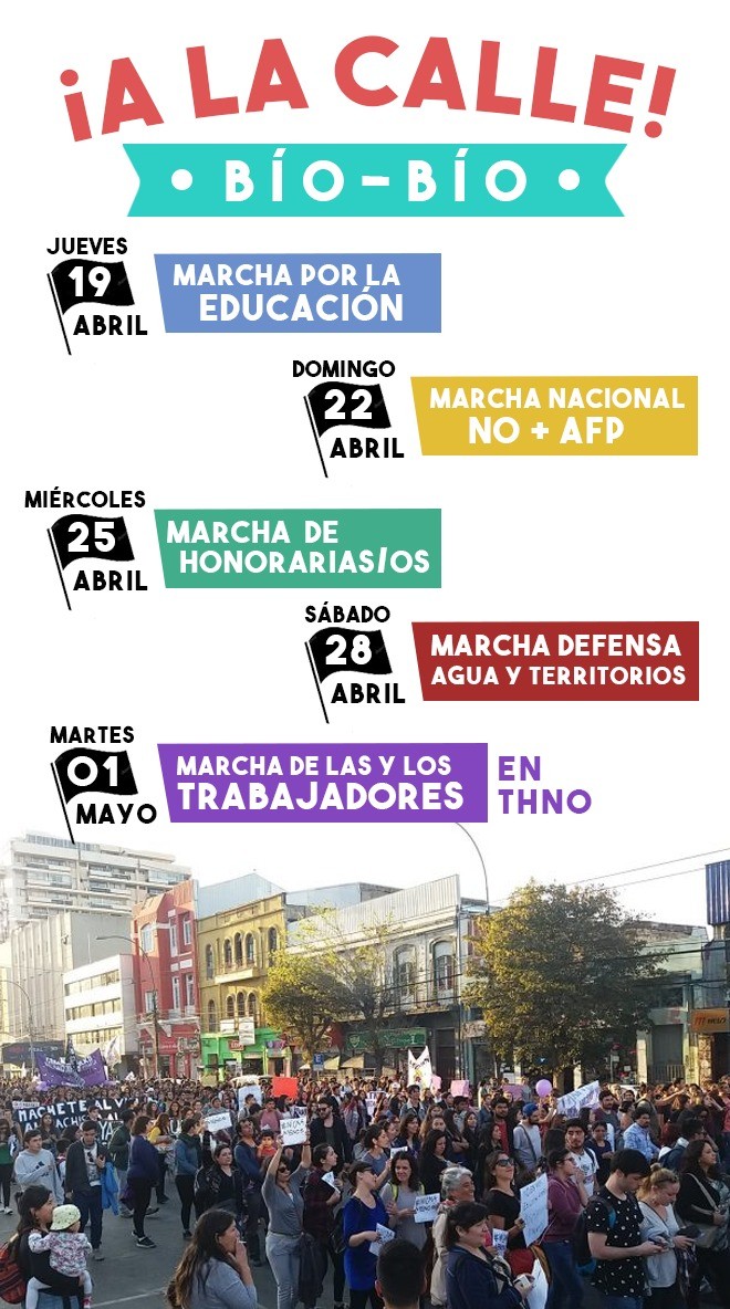 Se trata de las marchas convocadas para los días 19, 22, 25 y 28 de abril, a la que se suma la conmemoración del 1º de Mayo en Talcahuano. El 19 es el turno de los estudiantes, el 22 se movilizarán el Movimiento No+AFP, mientras que el 25 será el turno de los trabajadores a honorarios y el 28, el movimiento socioambiental.