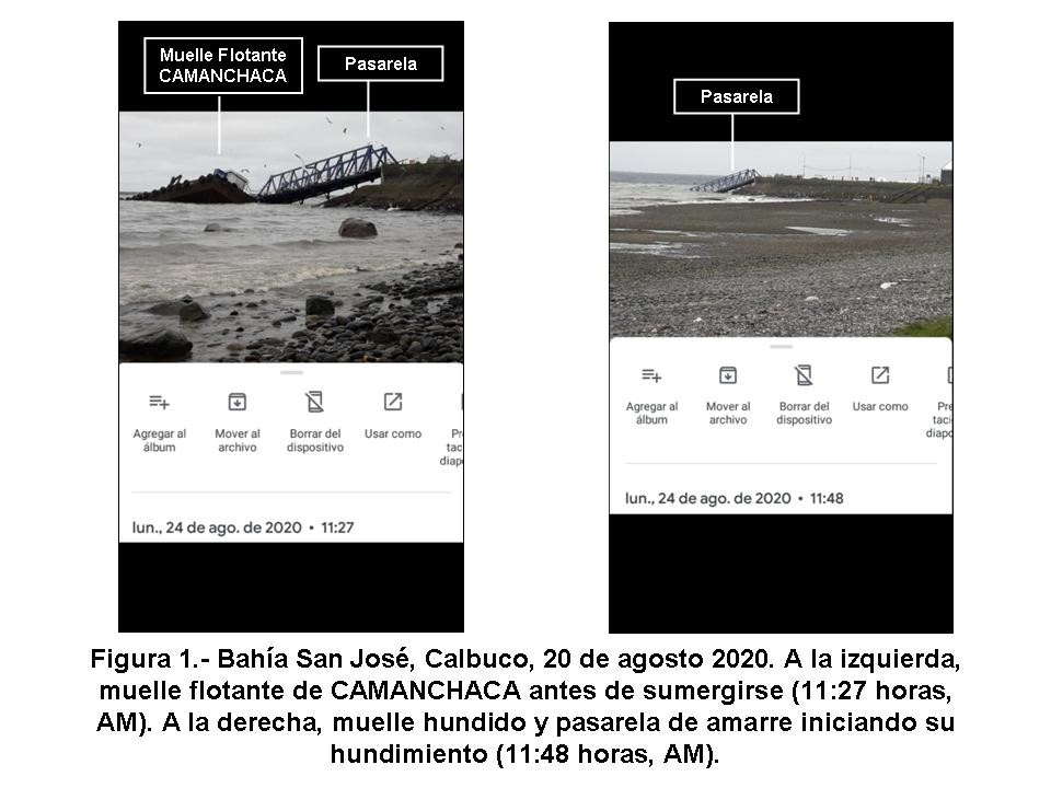 La Figura 1 corresponde a una captura de pantalla de mi celular que indica la hora y fecha en que el muelle flotante permanece aún a la vista, a las 11:27 horas de la mañana del 24 de agosto. Sólo 21 minutos después, el muelle ya se ha sumergido y la pasarela que lo conectaba a tierra iniciaba su inmersión.