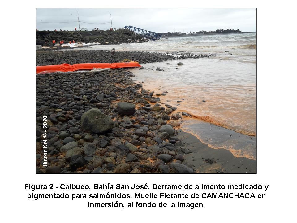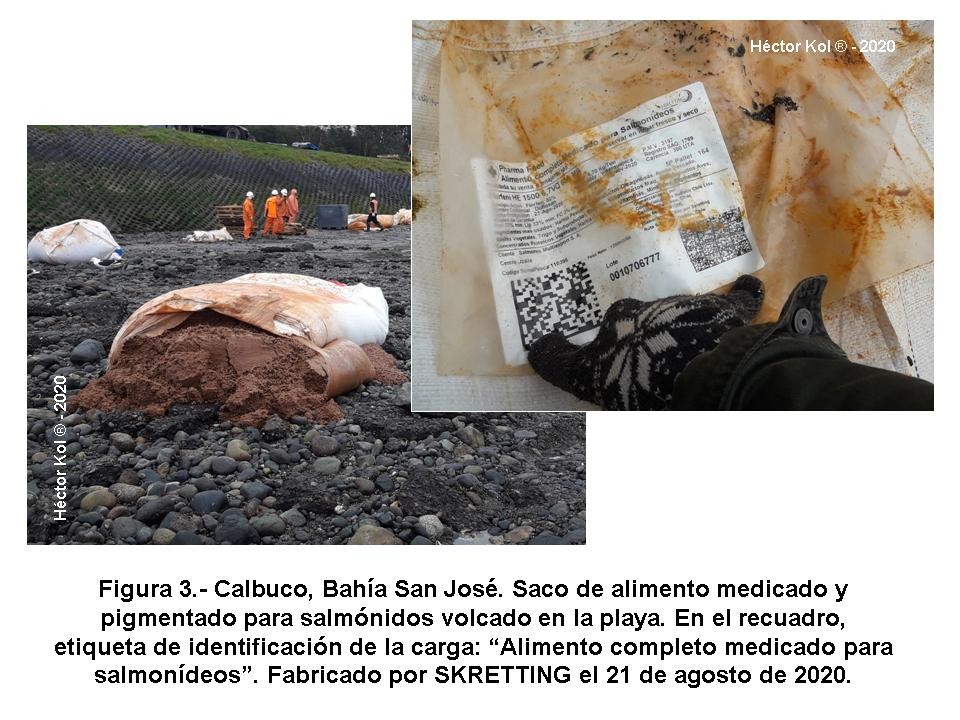 Sobre la playa de piedras de Bahía San José, las aguas anaranjadas por el alimento pigmentado derramado al mar se aprecian en la Figura 2, mientras que la Figura 3 muestra uno de los sacos de alimento para salmones tirado en la playa, con su contenido derramándose hacia el mar. El recuadro corresponde a la etiqueta que llevaba el saco: Alimento MEDICADO con el antibiótico Florfenicol al 50%, a una concentración de 6, 5 kilos de antibiótico por tonelada, es decir, unos 7 kilos de antibiótico (formulación comercial) por cada saco de 1.250 kilos, como el de la fotografía. Fabricado por Skretting , Planta Pargua, el 21 de agosto de 2020 y con destino a Aysén.