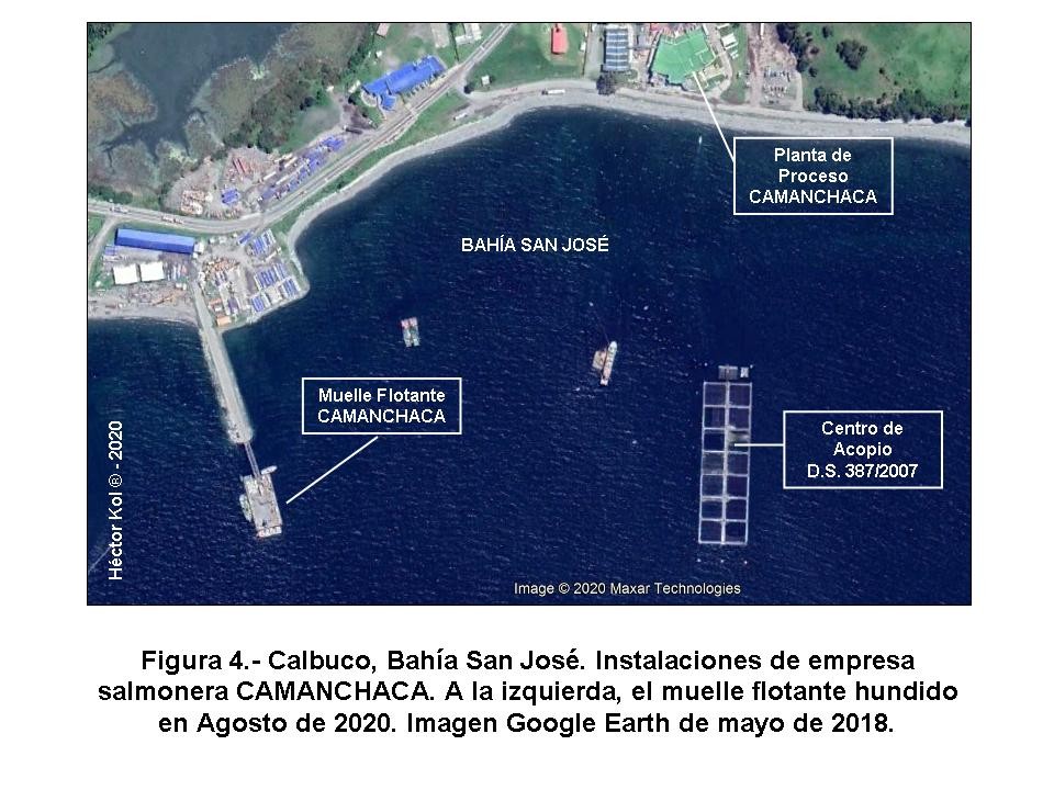 La Figura 4 muestra una imagen satelital de la Bahía, disponible en Google Earth (GET) de mayo del 2018, donde se aparecen las instalaciones principales de Camanchaca en este, su feudo, dentro de la Comuna de Calbuco. A la izquierda de la imagen, el Muelle Flotante siniestrado.