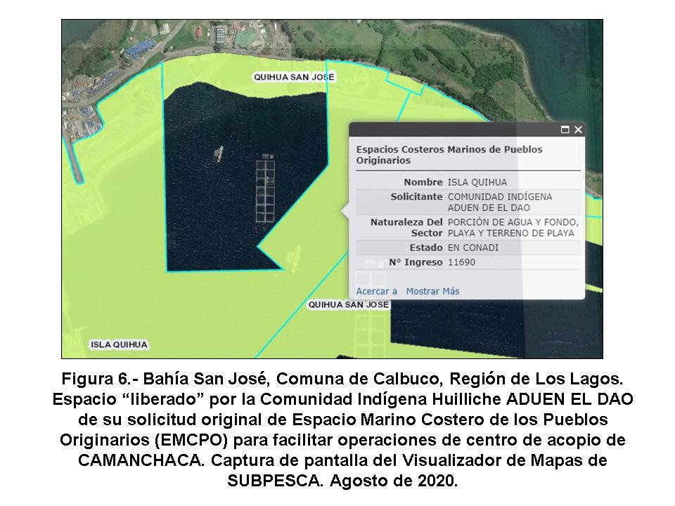 La Gobernación Marítima ha señalado que Camanchaca no ha podido renovar su concesión porque está inserta en una solicitud de Espacio Marino Costero de los Pueblos Originarios (EMCPO- Ley Lafkenche) justificando la continuidad de operaciones de un centro de acopio ilegal en una concesión que está vencida, pero esa información es falsa: la Comunidad Huilliche Aduen El Dao, de Calbuco, ya le entregó el espacio a Camanchaca, restándola de su solicitud de EMCPO “Isla Quihua” mediante la Solicitud de Exclusión Nº 11690 del 26 de septiembre de 2016, entregada a Subpesca y que “libera” el espacio que ocupa hoy, de manera ilegal, el centro de acopio referido, como muestra la Figura 6.
