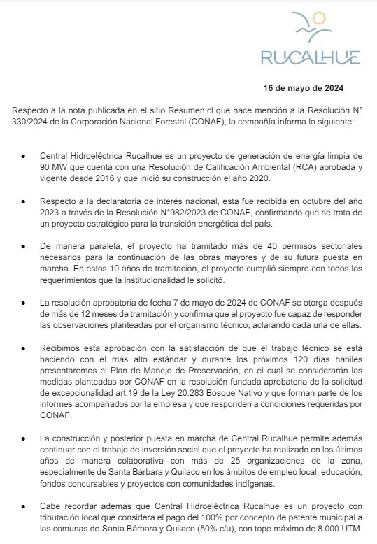 En contacto con RESUMEN, la empresa Rucalhue Energía SpA, quien encabeza el proyecto hidroeléctrico, aclaró que cuenta con declaratoria de interés nacional desde octubre de 2023 planteando que la resolución confirma "que se trata de un proyecto estratégico para la transición energética del país".