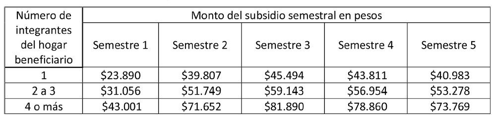 Junto a las alzas, el gobierno anunció un subsidio eléctrico que, hasta la fecha, consiste en un monto de $120 millones de dólares a distribuirse en las cuentas de seis meses de los 1,6 millones de familias que lograron postularon, equivalente a menos del 20% de los hogares del país, y cuyo monto depende de la cantidad de integrantes que tenga el grupo familiar (ver tabla).
