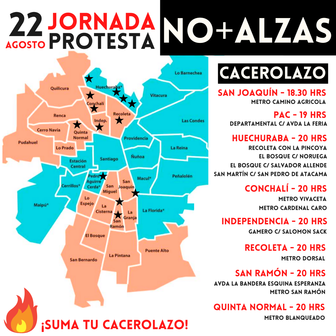 En respuesta a la escalada de alzas a las cuentas de luz y al costo de la vida, un conjunto de organizaciones de la Región Metropolitana y Valparaíso ha convocado a una jornada de protesta para este jueves 22 de agosto. Exigen al gobierno que en vez de cargar un aumento del 70% al consumo residencial de luz, se renegocien los contratos con las empresas eléctricas, se compense oportunamente a todas las familias afectadas por los daños generados por los cortes de luz y se inicie un proceso para que la energía eléctrica vuelva al control público producto de la falta de la negligente gestión privada.