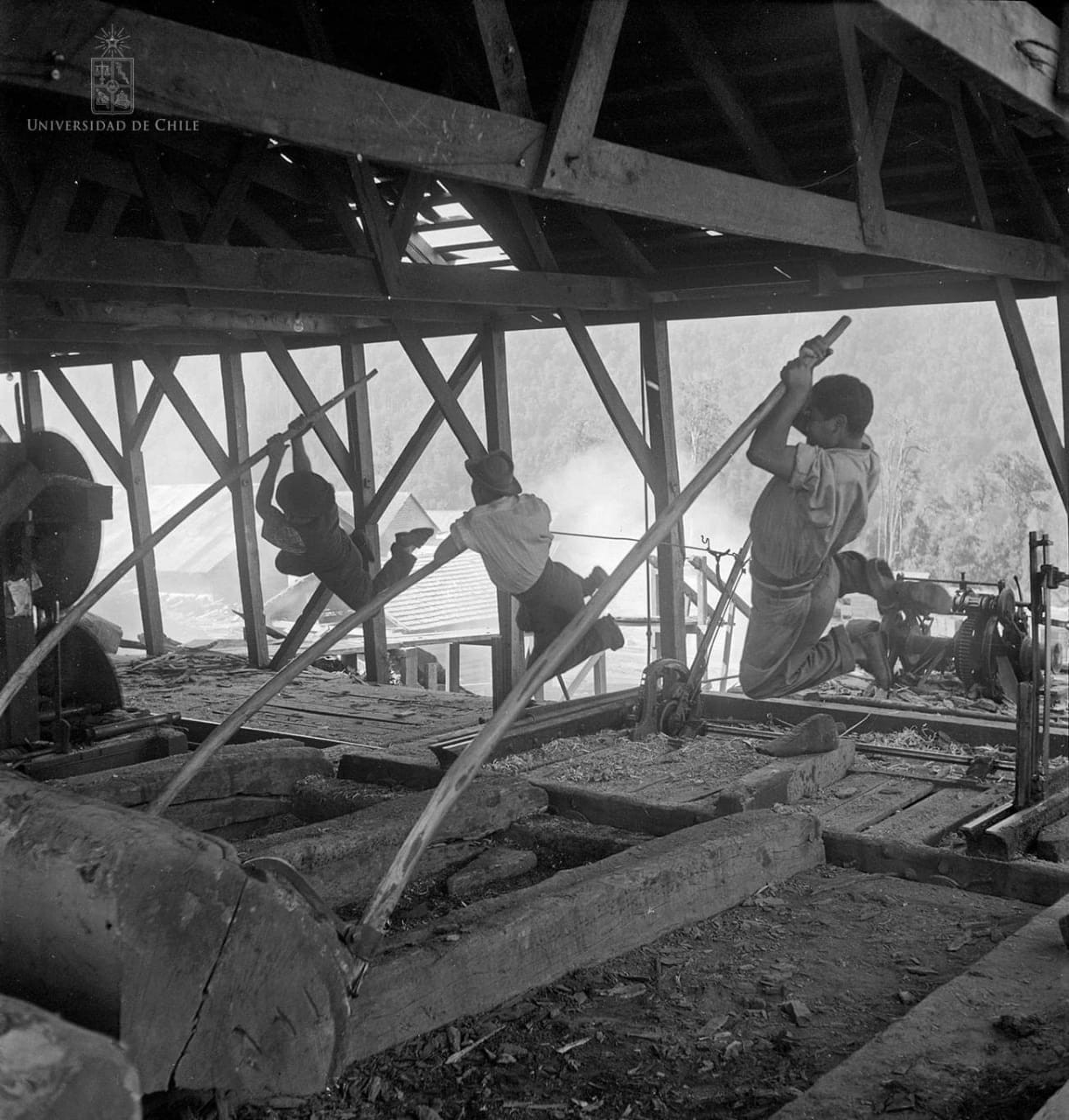 Trabajadores del Complejo Maderero Panguipulli. Autor Roberto Montandón, archivo central Andrés Bello de la Universidad de Chile