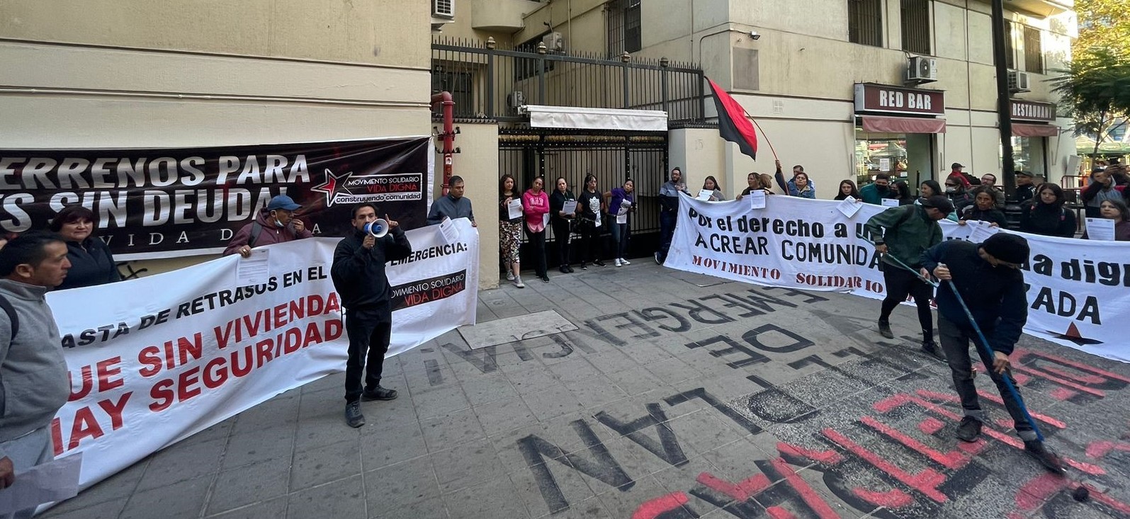 Durante la mañana de este martes, un centenar de personas se manifestaron frente al Ministerio de Vivienda en la Región Metropolitana, cortando de forma intermitente la Alameda para luego concentrarse en la entrada del ministerio, donde un grupo de cinco mujeres se encadenó, exigiendo ser recibidas por el ministro Carlos Montes.