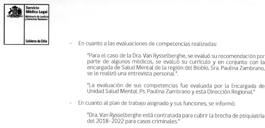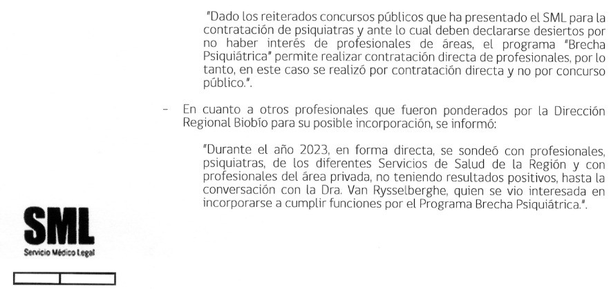 Ante esto RESUMEN solicitó vía transparencia los argumentos, criterios de selección, motivos y ficha de evaluación que acreditaran la contratación de van Rysselberghe. En su respuesta, la Dirección Regional Biobío explicó que la contratación fue vía trato directo. Esto, debido a que "dado los reiterados concursos públicos que ha presentado el SML para la contratación de psiquiatras y ante lo cual deben declararse desiertos por no haber interés de profesionales de áreas, el programa "Brecha Psiquiátrica" permite realizar contratación directa de profesionales, por lo tanto, en este caso se realizó por contratación directa y no por concurso público".