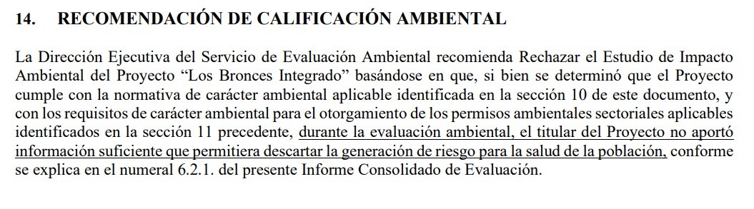El documento plantea que "si bien se determinó que el Proyecto cumple con la normativa de carácter ambiental aplicable identificada en la sección 10 de este documento, y con los requisitos de carácter ambiental para el otorgamiento de los permisos ambientales sectoriales aplicables identificados en la sección 11 precedente, durante la evaluación ambiental, el titular del Proyecto no aportó información suficiente que permitiera descartar la generación de riesgo para la salud de la población".