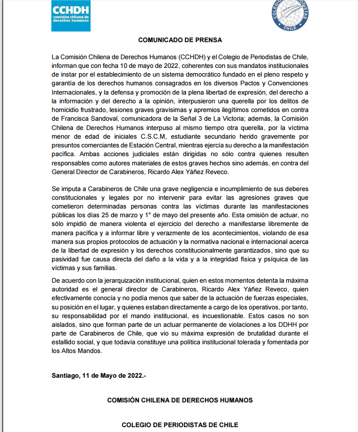 Tras el brutal ataque con arma de fuego, que mantiene a la periodista de Señal 3 La Victoria, Francisca Sandoval, en riesgo vital, la Comisión Chilena de Derechos Humanos y el Colegio de Periodistas de Chile, presentaron una querella por distintos delitos. Con la acción judicial se busca la responsabilidad en los hechos del general director de Carabineros, Ricardo Yáñez y quienes resulten responsables del cobarde disparo contra la reportera.Por Juan Contreras Jara