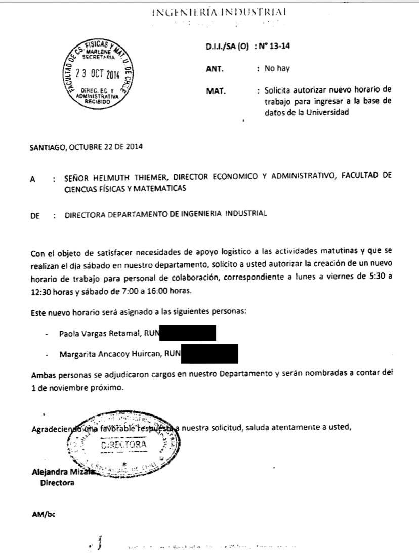 "La directora subrogante del departamento de Ingeniería Industrial, Alejandra Mizala, que fue la que pidió la autorización al director económico de todo el campus para que se autorizara el horario de las 05:30 am. Consta en el expediente sumarial, que a través de un oficio ella solicitó autorización para que Margarita y una compañera entrara a las 05:30 de la mañana", relata Melisa Rodríguez, asesora legal de a Agrupación Amigas y Colegas por Justicia para Margarita.