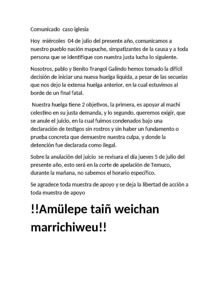 Los presos Pablo y Benito Trangol señalaron que buscan anular su juicio "en el cual fuimos condenados bajo una declaración de testigos sin rostro y sin haber un fundamento o prueba concreta que demuestre nuestra culpa, y donde la detención fue declarada como ilegal" señalaron.