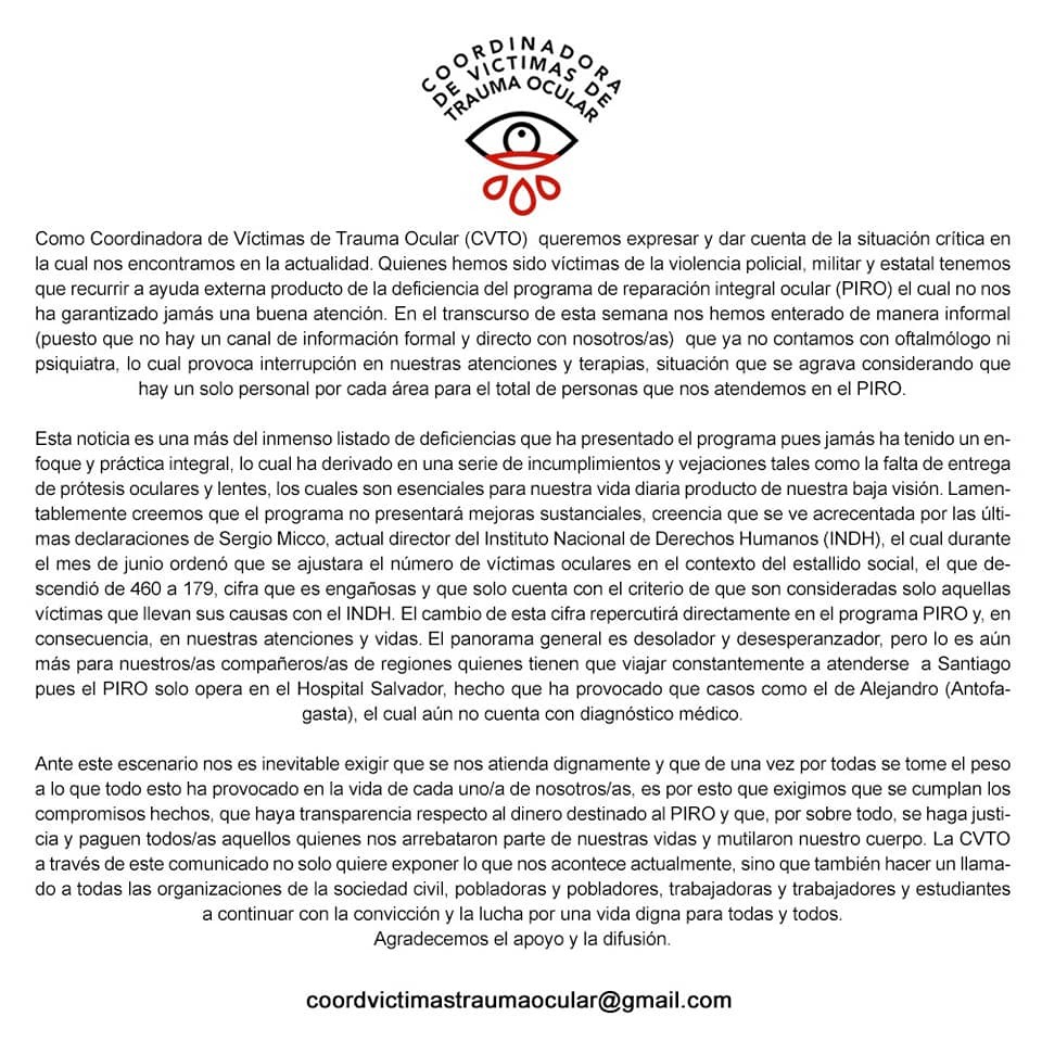 A través de un comunicado público, el espacio donde se agrupan diversas víctimas de la violencia estatal desplegada durante el contexto del Estallido Social informó que la deficiencia del PIRO se ha visto profundizada luego de que "nos hemos enterado de manera informal (...) que ya no contamos con oftalmólogo ni psiquiatra".