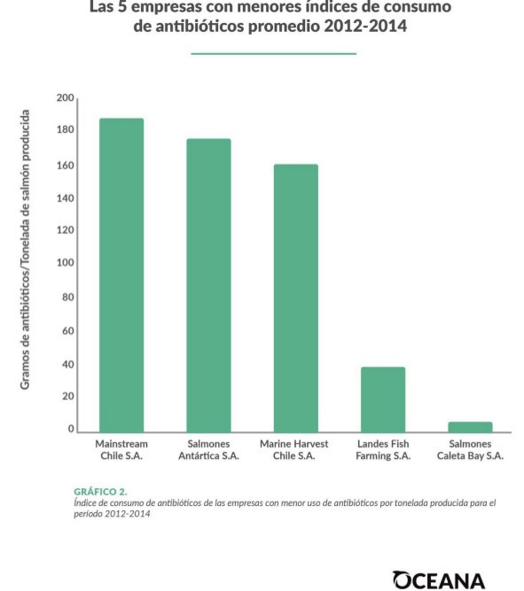 Según el informe, en 2016, por cada tonelada de salmón cosechada se usaron 476 gramos de antibióticos. Mientras que en 2015 se registraron 577 gramos por tonelada. Además señala que mientras disminuyó el promedio total de los antibióticos usados por cada compañía, 7 de las 15 empresas medidas incrementaron el uso: son las empresas Cermaq, Ventisqueros, Yadran, Multiexport, Camanchaca, Friosur y Salmones Magallanes. por su parte, Australis no reportó sus cifras en este tema.