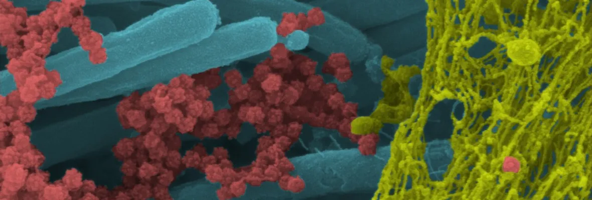 En las imágenes con colores añadidos se muestra a los viriones SARS-CoV-2 en rojo, los cilios de las células respiratorias en azul y las hebras de mucosidades en amarillo.