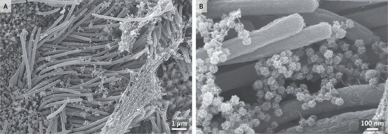 Imagen A con escala de 1 micrómetro (µm) equivalente a la milésima parte de un milímetro. Imagen B con escala de 1 nanómetro (nm) equivalente a la millonésima parte de un milímetro. Foto: Dra. Camille Ehre. DOI: 10.1056/NEJMicm2023328