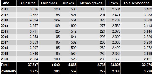 La Comisión registra que desde el año 2011 hasta el 2020 han ocurrido un total de 37.747 siniestros en el país que han involucrado bicicletas, los cuales han provocado la muerte de 1.040 ciclistas y a 5.665 les ha provocado lesiones de gravedad. El cuadro de registro también evidencia una notoria disminución de la siniestralidad el año 2020, probablemente debido al confinamiento masivo producto de la pandemia.
