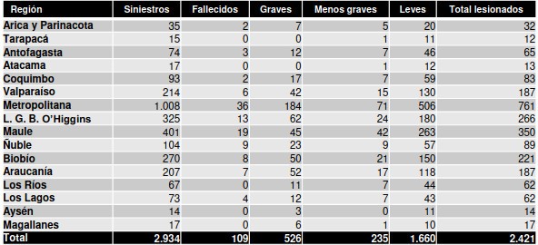 De acuerdo a la CONASET (Comisión Nacional del Tránsito) el 2020 se registraron en el país 64.707 siniestros de tránsito, provocando la muerte de 1.485 personas fallecidas y 42.103 lesionadas. En 2.934 de estos hechos participaron bicicletas, «dejando 109 ciclistas fallecidos y 2.421 lesionados (526 graves, 235 menos graves y 1.660 leves)».