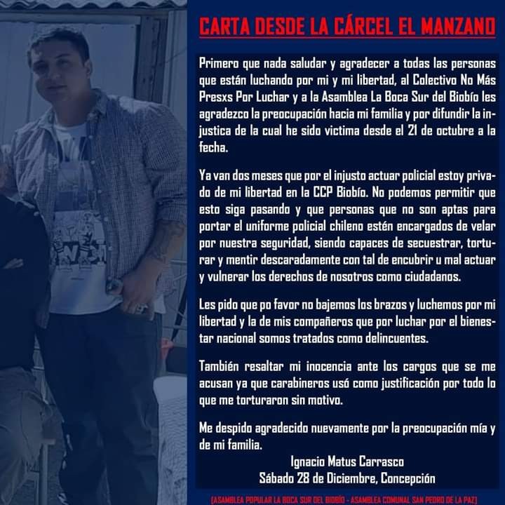 Ignacio Matus fue detenido el 21 de octubre en la población San Pedro de la Costa a las 22:30 hrs. de la noche, mientras participaba con sus vecinas y vecinos de un cacerolazo. Tras la arremetida de efectivos de Fuerzas Especiales de Carabineros, el joven fue detenido, golpeado y trasladado a la 6ta Comisaria de San Pedro de la Paz.