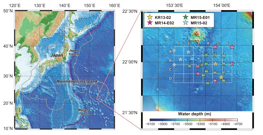 Localización y mapas batimétricos del área investigada. Los símbolos de estrella representan los sitios de muestreo y los códigos de colores corresponden a cada crucero de investigación señalado en el artículo. El rectángulo blanco muestra el mapa detallado del área objetivo de la estimación de interés comercial. Fuente: (Takaya Y., et al 2018 | DOI:10.1038/s41598-018-23948-5)