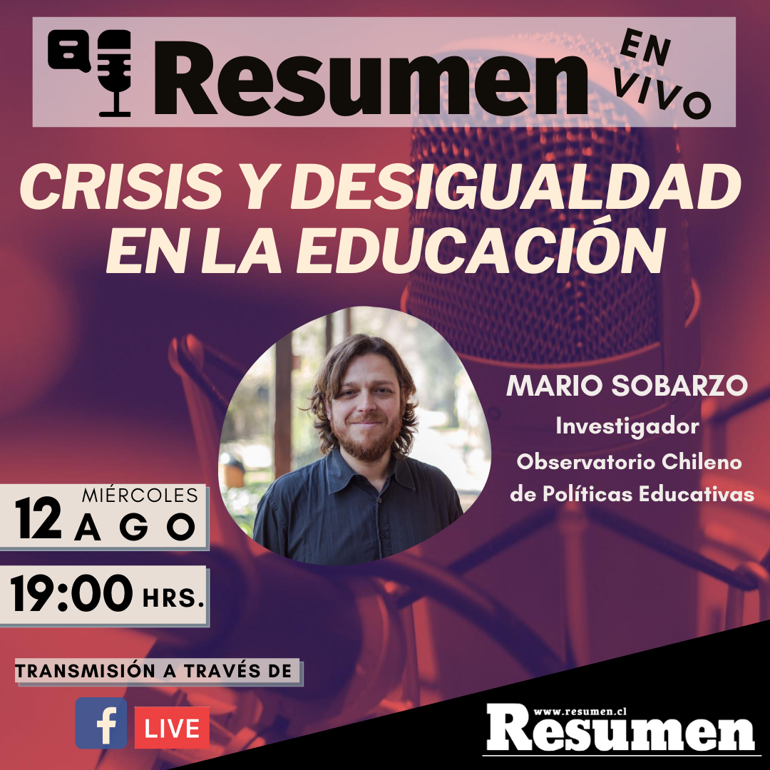 [resumen.cl] Considerando la situación en la que se encuentra el sistema educativo del país, Resumen realizará un programa dirigido al análisis de los elementos de desigualdad y crisis que se han vuelto a tomar la agenda pública. En la décima entrega de #ResumenEnVivo, a realizarse este miércoles 12 de agosto, se conversará junto a Mario Sobarzo, investigador del Observatorio Chileno de Políticas Educativas.