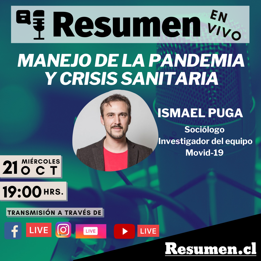 [resumen.cl] A las 19:00 de este miércoles se realizará la entrega N° 18 de #ResumenEnVivo, donde conversaremos con Ismael Puga, sociólogo e investigador del equipo de Monitoreo Nacional de Prácticas y Síntomas COVID-19 (Movid-19) sobre el manejo que se ha desarrollado sobre la pandemia y la situación actual de la crisis sanitaria en Chile.