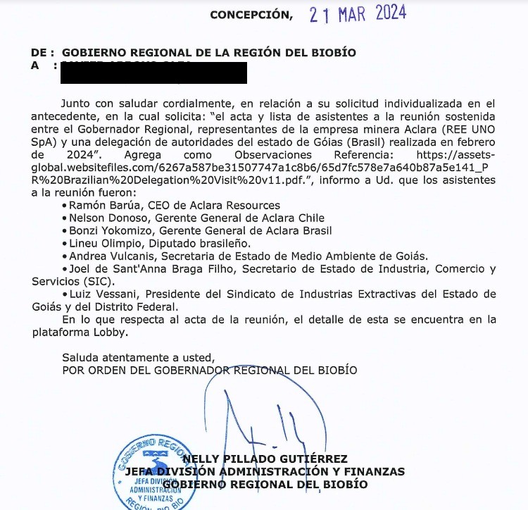 Ante esto, RESUMEN solicitó información vía transparencia al Gobierno Regional para acceder al acta y listado de asistentes a la reunión sostenida entre el gobernador Díaz, representantes de la minera y la delegación brasilera. En su respuesta, el GORE informó que los asistentes fueron: Ramón Barúa (CEO de Aclara), Nelson Donoso (Gerente General de Aclara de Chile), Bonzi Yokomizo (Gerente General de Aclara Brasil), Lineu Olimpio (diputado brasileño), Andrea Vulcanis (secretaria de Estado de Medio Ambiente de Goiás), Joel de Sant'Anna Braga Filho (secretario de Estado de Industria, Comercio y Servicios) y Luiz Vessani (presidente del Sindicato de Industrias Extractivas del Estado de Goiás y del Distrito Federal).