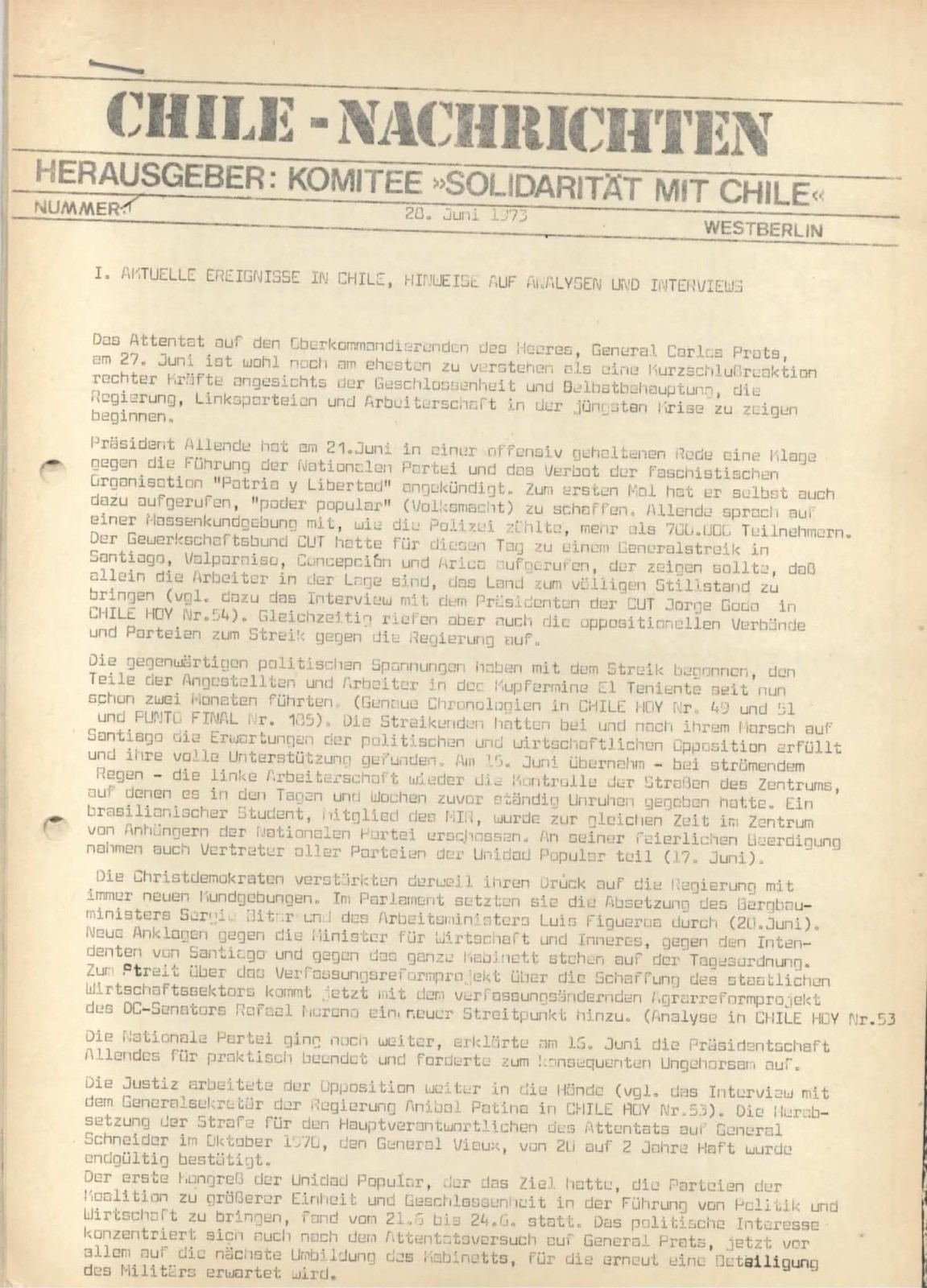 Como señala en el “quienes somos” de su página web: “La revista servía como un medio de información y comunicación para todxs aquellxs interesadxs en la situación política de Chile, ya que no había mucha información divulgada por los medios establecidos”. Si bien en su origen era un impreso en blanco y negro que no llegaba a los 100 ejemplares, consumado el Golpe Militar en Chile, el tiraje aumentó a los 6 mil. La situación de violaciones a los Derechos Humanos en Chile tenía perpleja a la sociedad alemana, pero también llamó la atención la implementación de un modelo económico, que más tarde se haría mundial con la llegada de Reagan al gobierno de Estados Unidos y Thatcher al Reino Unido.